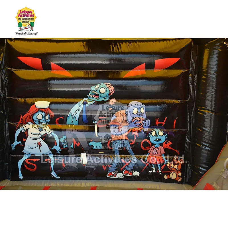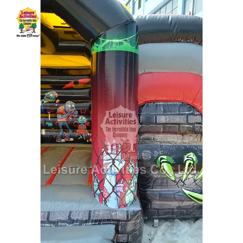Слайдпен қоршалған шағын үрленетін көп ойнайтын серпілу сарайлары: бұл зомби-тематикалық «Haunted Combo» үрлемелі балаларды қызықты мультфильм-қорқынышты эстетикасымен баурап алуға арналған. Қою қызыл, жылтыр қара және қорқынышты жасыл және көк түстердің батыл үйлесімі жарқын, қызықты орта жасайды. Динамикалық позалардағы мультфильм зомбилерінің үлкен, ойнақы графикасы - медбике, миды жейтін кейіпкер және ойыншық аюы бар зомби бала - қорқыныштан гөрі қызықтырақ. Төбеде жорғалап бара жатқан үлкен көк зомби, қабырғаларды жарып өткен тырнақты қолдар және бағандардағы тізбектер/графика сияқты интерактивті элементтер қиялды ойынды тудырады. Қорғаныш үстіңгі жабыны бар жабық құрылым көлеңке мен жеңіл жаңбырдан қорғауды қамтамасыз етеді, ал жабық слайд шытырман оқиғаға қосады. Биіктігі 10 фут оны ішкі және сыртқы пайдалану үшін жан-жақты етеді, Хэллоуин кештеріне, күзгі фестивальдерге, тақырыптық туған күндерге және ауладағы қорқынышты көңіл көтеруге өте ыңғайлы.
