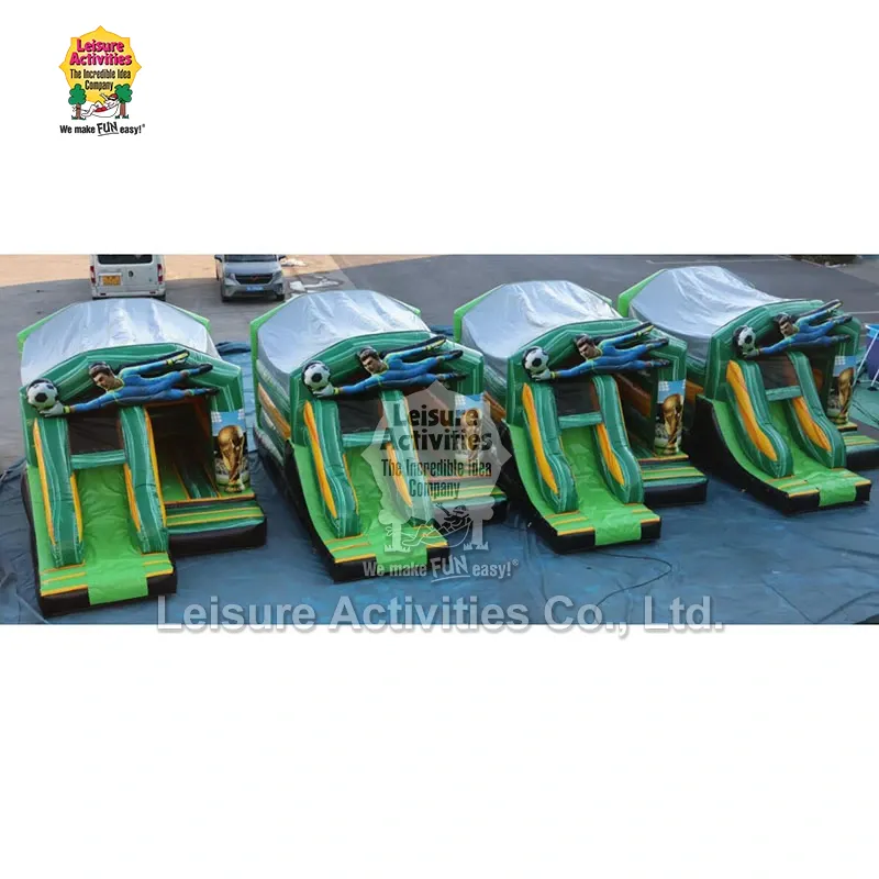 Leisure Activities® - Қытайдағы үрлемелі өнімдер мен тиісті аксессуарлардың кәсіби өндірушісі және жеткізушісі. Сырғымалы шағын үрлемелі көп ойнайтын футбол сарайлары - бұл секіру, өрмелеу және сырғанау мүмкіндіктерін біріктіретін футболға арналған шағын көп функциялы үрлемелі ойын құрылымы. Ол қақпашының 3D әшекейлерімен және кубок үлгілерімен бірге келеді. Оны Leisure Activities® Қытай зауыты дербес шығарады, қауіпсіз материалдары, ыңғайлы орнатуы және әртүрлі ішкі және сыртқы сценарийлерге жарамдылығы бар.