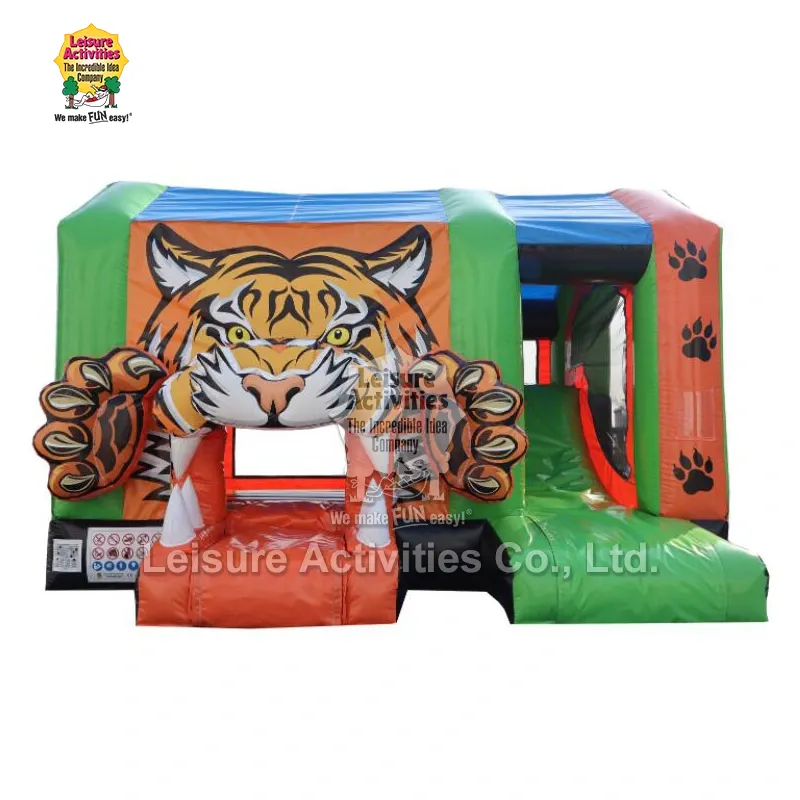 Leisure Activities® - Қытайдағы үрлемелі өнімдердің кәсіби өндірушісі және жеткізушісі. Стандартты Inflatable Multiplay Tiger Bouncy Castles - бұл жолбарыс тақырыбына арналған үрлемелі сарай, ол секіру, өрмелеу және сырғанау мүмкіндіктерін біріктіреді. Ол негізгі түстер ретінде лайм жасыл және қызғылт сары түстермен ерекшеленеді, кіре берісте 3D жолбарыс безендірілген. Оны небәрі 10 минут ішінде жылдам орнатуға болады.