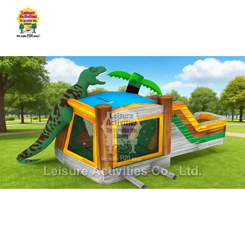 Super Inflatable Multiplay Jurassic Bouncy Castles Юра дәуірінің айналасында орналасқан. Жалпы дизайн динозаврлар әлемінің жұмбақ атмосферасын жаңғыртады. Сыртқы көріністе ретро табиғи түстер мен шынайы динозавр пішіндері бар, олар балалардың назарын тез аударып, әсерлі ойын тәжірибесін жасай алады. Көп функциялы модель ретінде өнім серпілу аймағы, өрмелеу аймағы және көңілді өтулер сияқты әртүрлі ойын сценарийлерін біріктіреді. Ол бір серпілу режимінен шығып, бір уақытта ойнайтын бірнеше баланың қажеттіліктерін қанағаттандырады, көңілді және интерактивтілігін арттырады. Өнім өлшемі коммерциялық сценарийлер үшін қолайлы, ал инфляциядан кейін ойын тәжірибесін де, орынның жарамдылығын да ескере отырып, кеңістік кең. Бұл саябақ, ойын алаңы немесе іс-шараны жалға алу болса да, оны икемді түрде орналастыруға болады.